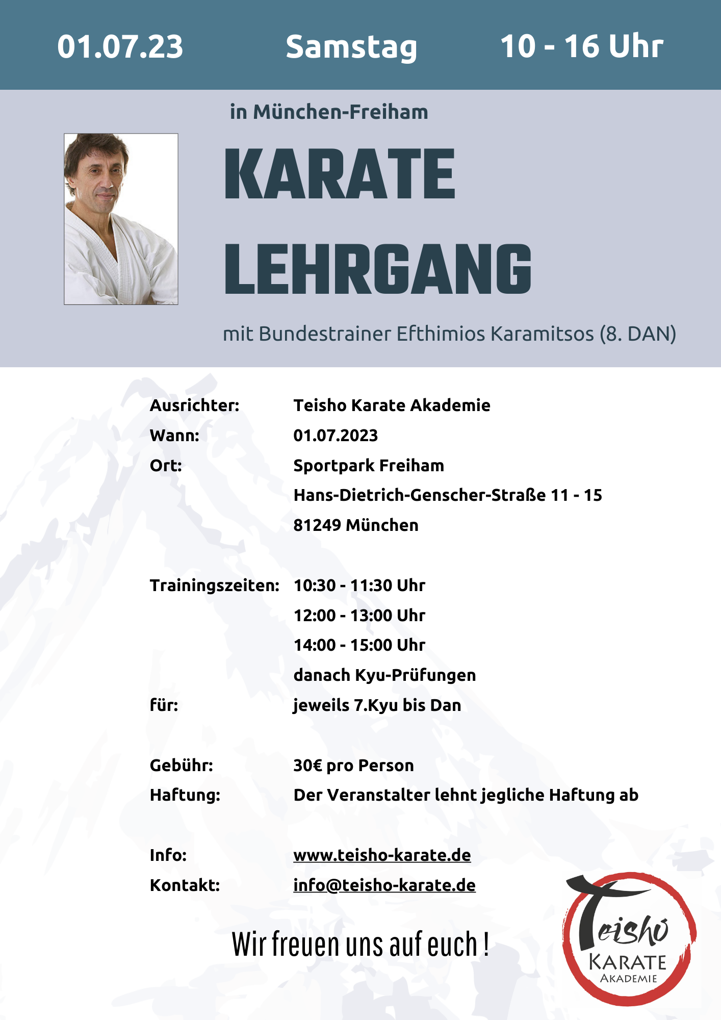 Donnerstag: 19:00 - 19:45 Uhr "normales" Oberstufen Training 19:45 - 20:15 Uhr Kata-Spezial Wann welche Kata? 28.04. Jiin 05.05. Jitte 12.05. Wiederholung von Jiin & Jitte 19.05. Tekki Nidan - Wankan 26.05. - Feiertag 02.06. Wiederholung von Tekki Nidan & Wankan 30.06. Sochin 07.07. Tekki Sandan 14.07. Sochin und Tekki Sandan wiederholen 21.07. alle Katas vom 28.04. - 14.07. wiederholen Oss Euer Klaus